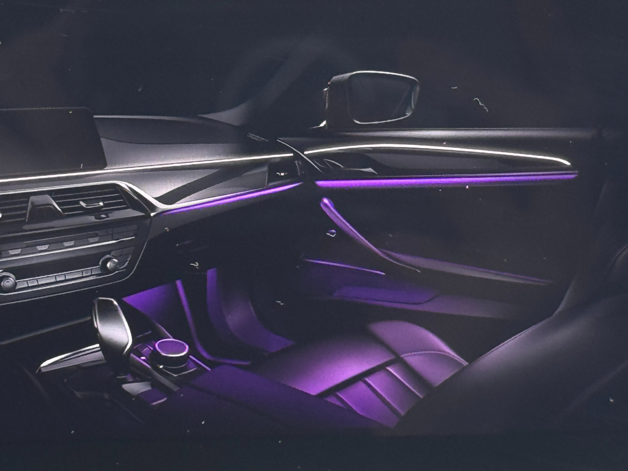 The M Sport Package is what separates this 540i from every other 5-Series on the market. On the exterior, the package adds the full M Aerodynamic body kit, which includes the more aggressive front bumper with large side air intakes, sculpted M side skirts, and a refined sport diffuser in the rear that gives the car a lower, tighter stance. The Shadowline high-gloss black exterior trim replaces the chrome, tying perfectly into the deep Black Sapphire Metallic paint for that stealth, executive look that BMW absolutely nails on their M builds. The LED fog lights and Shadowline window trim complete the visual flow, while the subtle M badging hints at what’s underneath without trying too hard. This particular 540i goes next level with the 20” BMW Individual V-Spoke 759i wheels — a rare upgrade that looks incredible in person and fills the wheel wells just right. The stance, the body lines, and the proportions all come together to make this one of the cleanest, meanest sedans BMW has ever produced.
