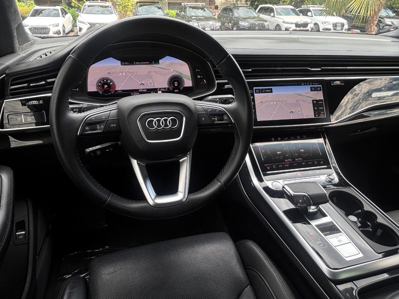 Inside the cabin, the Luxury Package transforms the Q7 into an executive level space. Soft touch Valcona leather seats with contrast stitching, heated and ventilated up front with full massage functionality, heated in the rear, and paired with a heated steering wheel give this SUV a year round advantage. The panoramic sunroof included in the Warm Weather Package adds natural light throughout the cabin, while four zone climate control keeps each passenger comfortable no matter the season. A third row seat expands seating capacity when needed, while folding flat when not in use for increased cargo space. Combine this with Audi’s precision fit and finish, glass smooth panel alignment, metal trimmed switchgear, configurable ambient lighting, and heads-up display, and you get an environment that’s both functional and top tier in execution. It’s the type of cabin you sit in once and know you’re in something engineered to a different standard.