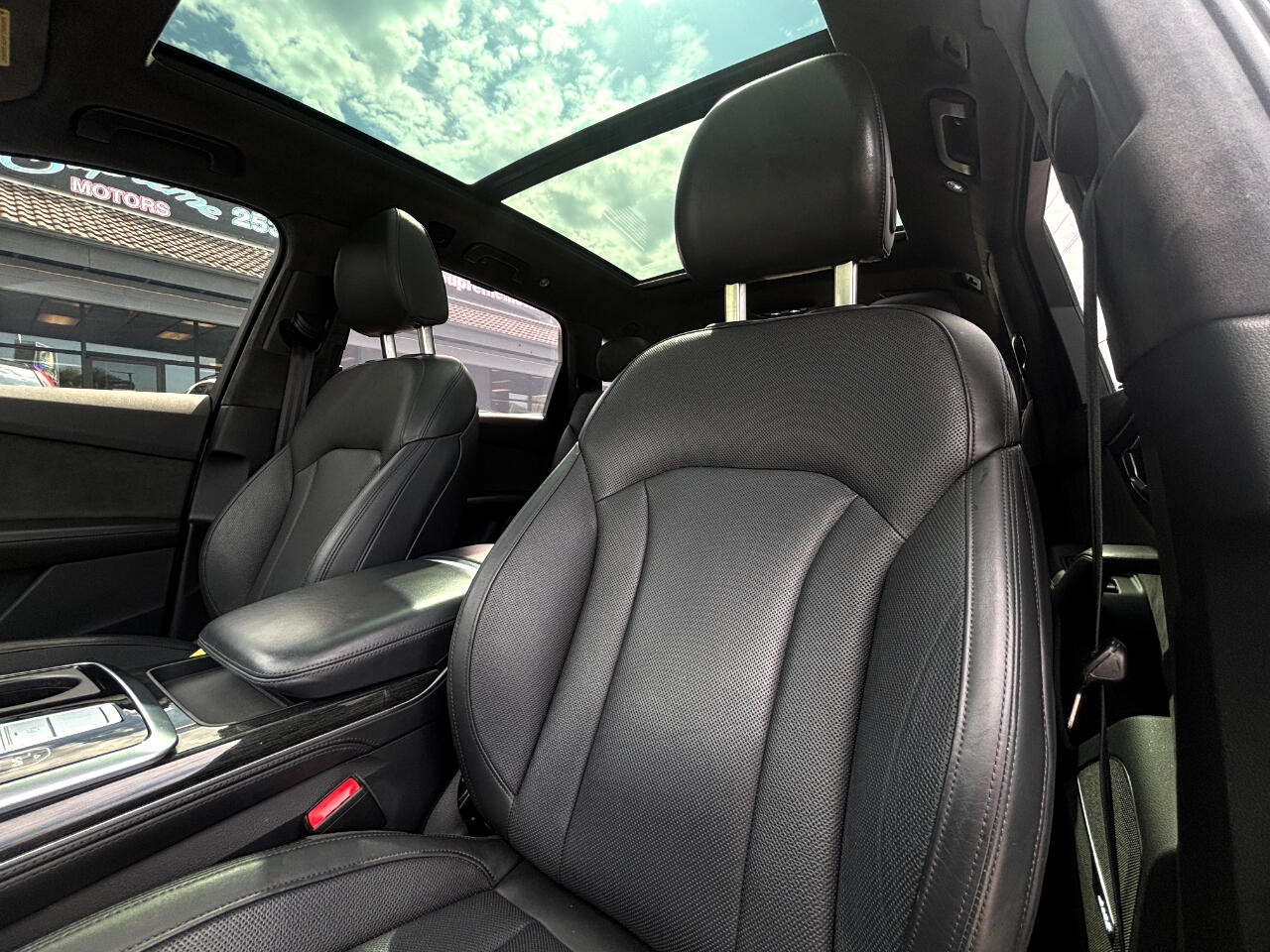 The exterior deserves equal recognition. The Black Optics Package enhances the visual presence of this Q7, replacing standard chrome trim with gloss black elements that accentuate the crisp body lines. Paired with the massive 21inch Audi Sport wheels, the stance is aggressive but sophisticated, delivering a look that separates it from other white Q7s on the road. Audi’s sharp LED headlight technology provides both form and function with advanced high beam assist, while the sculpted taillights finish off the rear in signature Audi fashion. This isn’t just another large luxury SUV, it’s a proper Audi, and the design language here communicates that instantly.